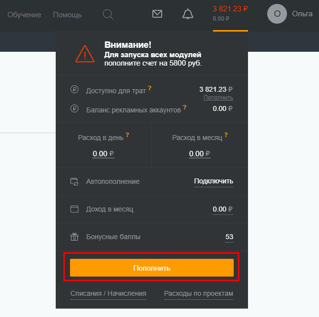 Дальнейшее пополнение аккаунта происходит через список проектов и кнопку Пополнить.