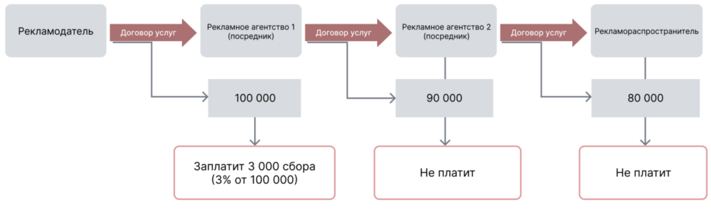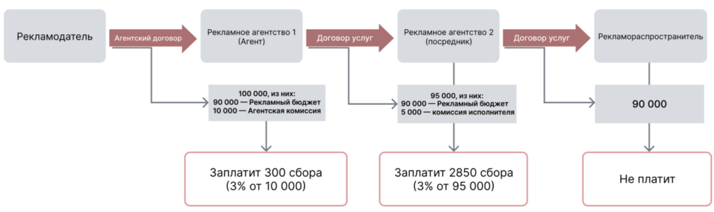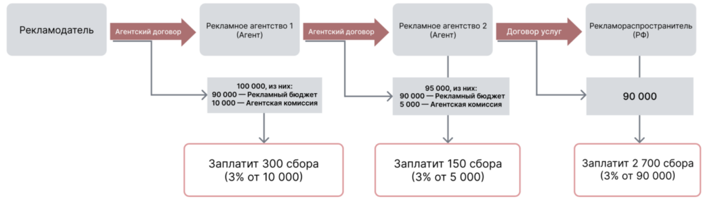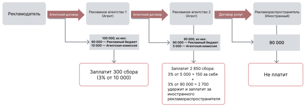Пример 4: В случае, если вся цепочка работает по агентскому договору, при этом реклама распространяется через иностранную площадку или лицо, обязанность по уплате 3% ложится на агентство, имеющее договор с этим лицом.