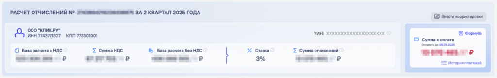 Точную сумму отчислений и сроки вы сможете увидеть в личном кабинете ЕРИР. Для просмотра войдите под вашим юрлицом и в левом меню выберите вкладку «Мои отчисления».