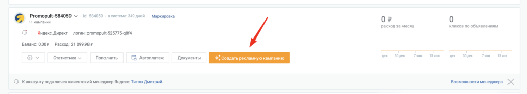 Для вызова ИИ-маркетолога нажмите на кнопку «Создать рекламную кампанию»: