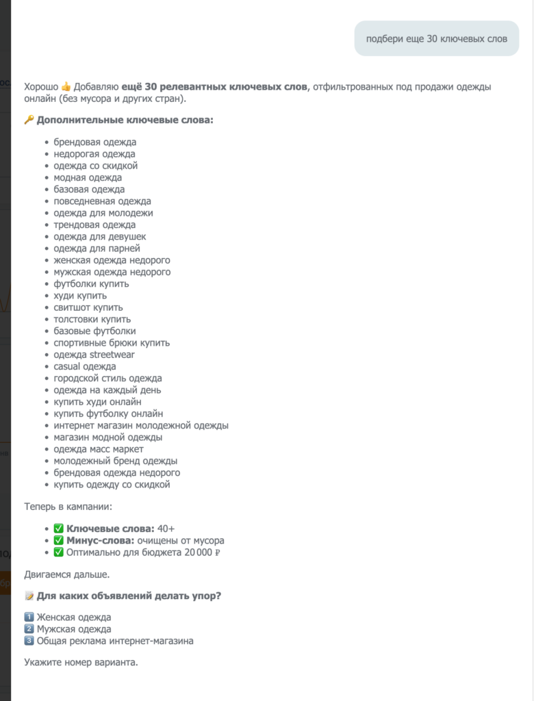 В процессе общения вы можете корректировать процесс со своей стороны. Например, попросить чат-бота подобрать больше ключевых слов: