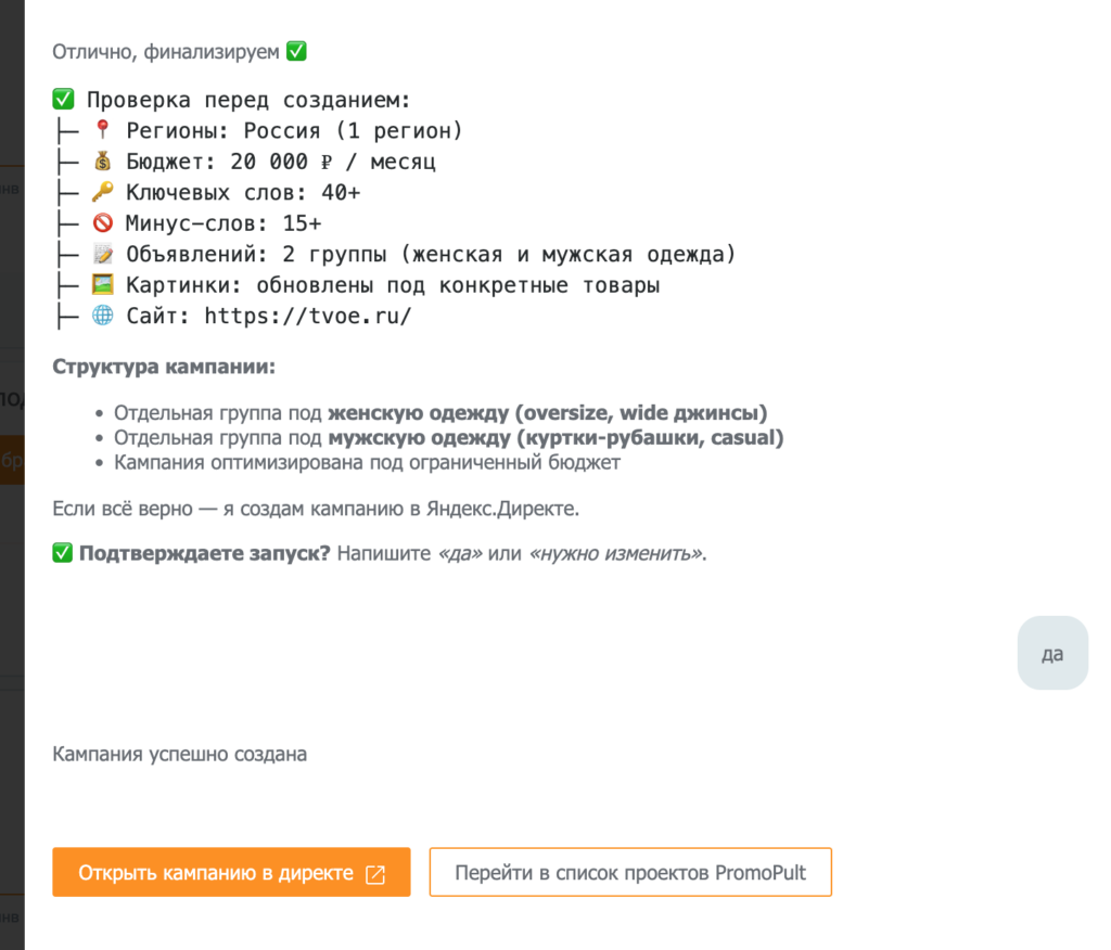 Создание рекламной кампании Яндекс Директ с помощью ИИ-маркетолога