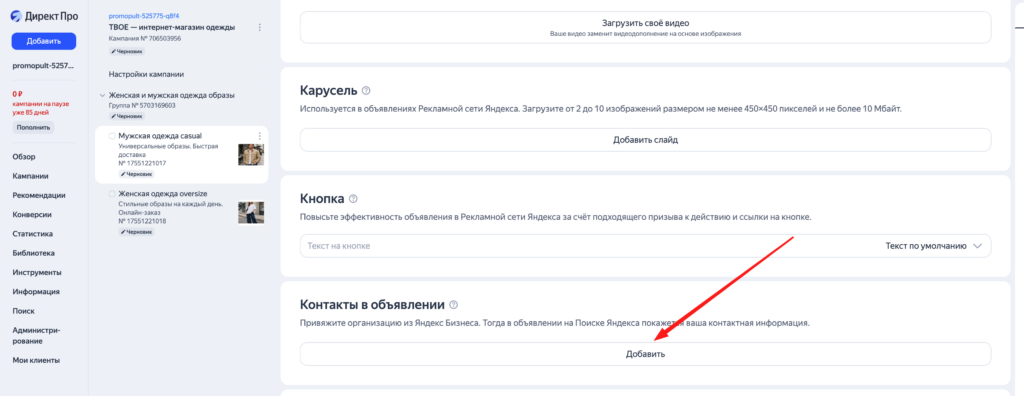 Обязательно откройте созданную рекламную кампанию и прикрепите карточку вашей организации, это существенно повысит качество объявлений: